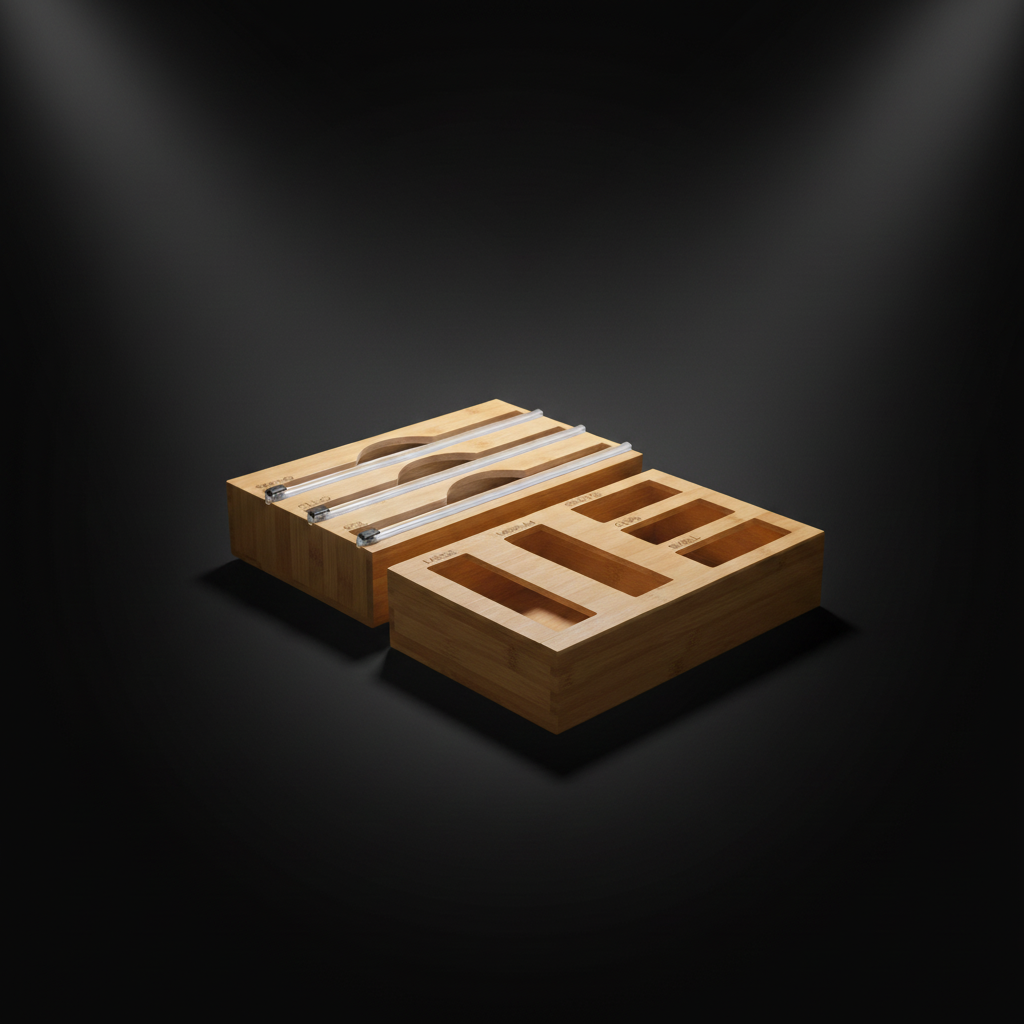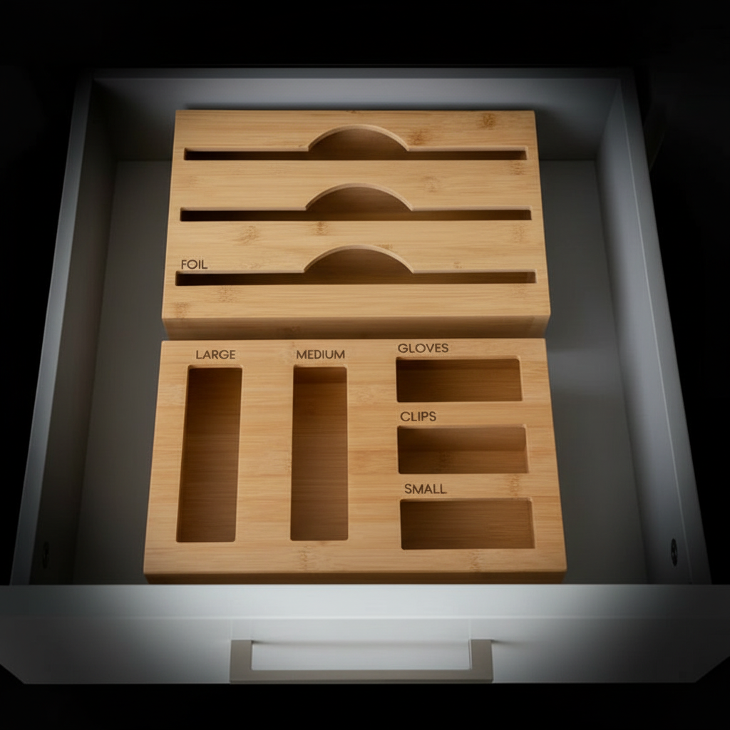 Bring calm and coordination to your kitchen with our Bamboo Food Wrap Dispenser & Sandwich Bag Organiser Pack—a clean, minimalist duo designed to reduce drawer clutter and keep everyday essentials within easy reach. Made to sit neatly inside most drawers (or mount to the wall), it keeps cling film, foil, baking paper, and sandwich bags organised, separated, and ready to use.